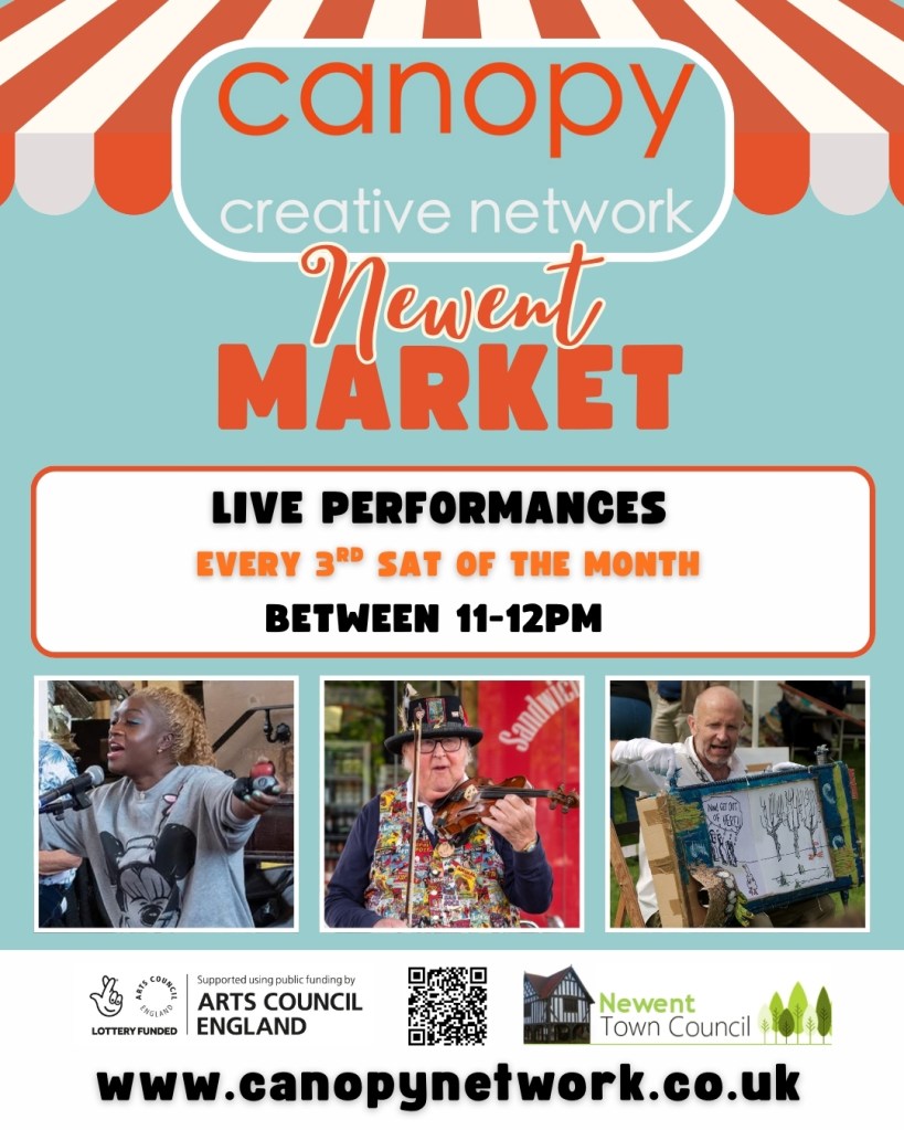 In partnership with Newent Town Council, Canopy is introducing a new programme of live performances at Newent’s Saturday Market—taking place on the third Saturday of every month from January 2026. Designed to enhance the shopping experience and bring fresh energy to the town centre, these performances will feature a variety of local talent, from musicians to artists and drama groups. Click for performers