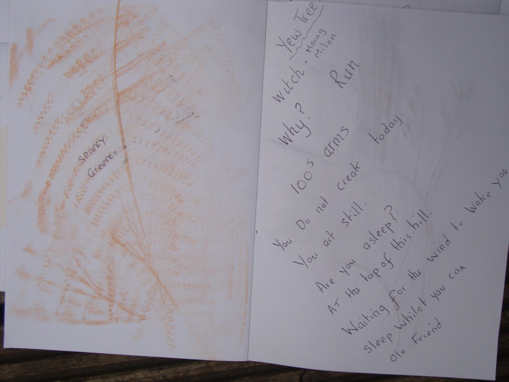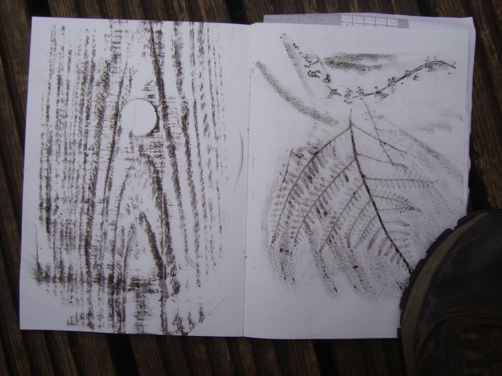 With wax crayons to the ready, Sara reminded us how to make an effective rubbing of woodgrain from a seat, leaves, seedheads and even a metal grid. At one point, everyone sat on fallen trunks to look up into the woods just to feel the magic of the place. ‘A little like walking through the back of the wardrobe’ , a reference to CS Lewis’s ‘Lion, the Witch and the Wardrobe’, into another world.