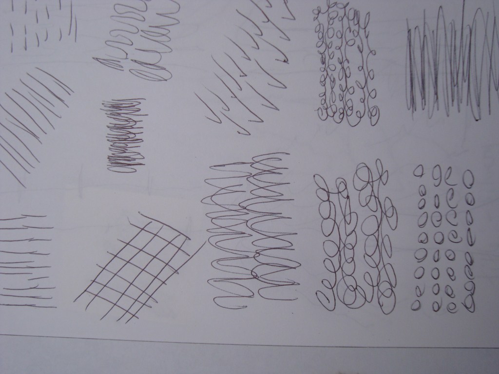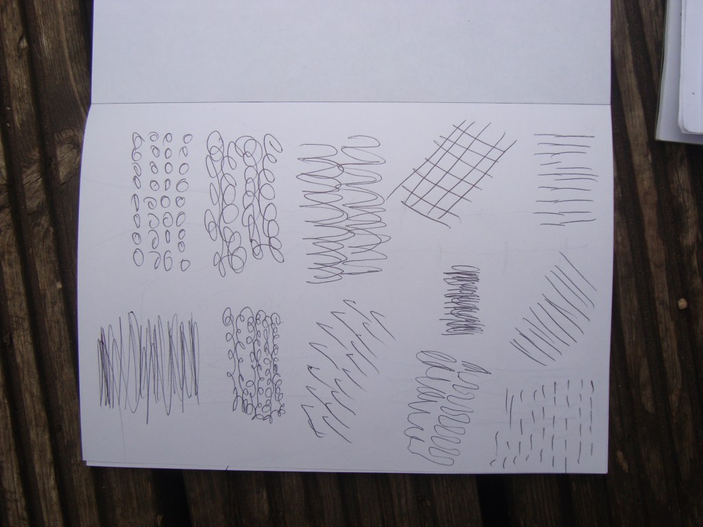 The weather was muggy and warm with a little drizzle in the air but mostly perfect for a stroll around the lower pond. Each person received a small sketchbook and pen. After a little warm up task where everyone was asked to make marks to fill a page, they looked at the trunk of a splendid sweet chestnut tree. Sara suggested that individuals respond through written words, photography and/or sketching. Photocopies of pen and reed drawings of trees by Van Gogh were shared specifically to appreciate how he used mark making to create beautiful textures. Further on down the path Sara showed the group a picture of a painting of tree trunks in a wood by Gustav Klimt.