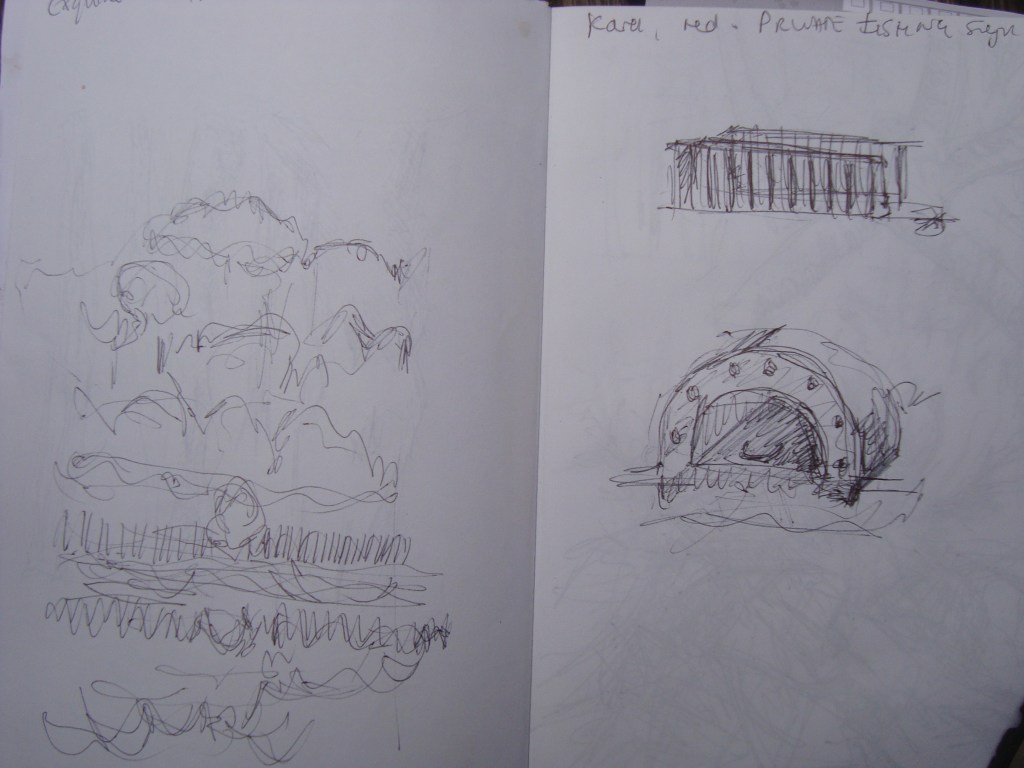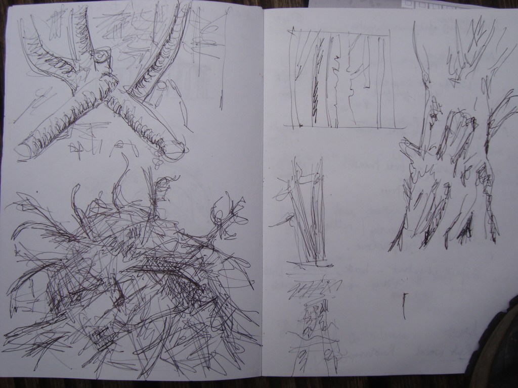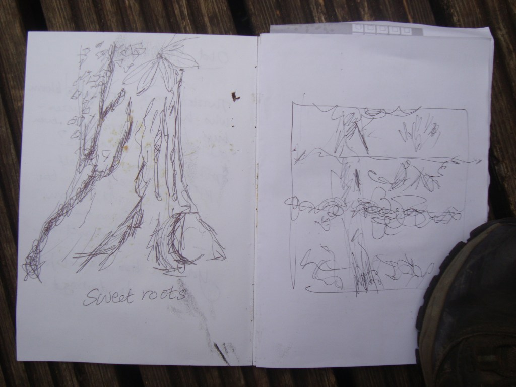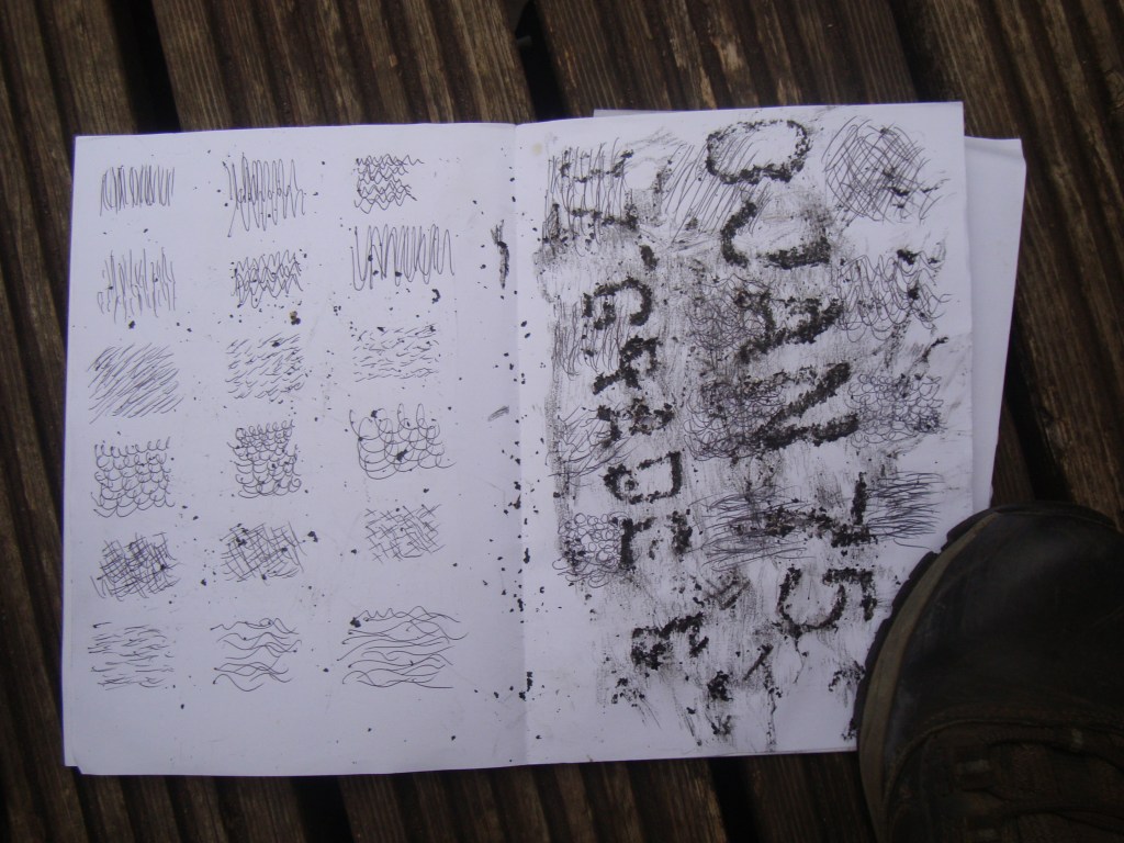 Crossing a small bridge to admire a cormorant grooming itself, the walkers used view finders to select a part of the pond to study in 3 – 4 minutes. Each sketch or activity was speedy, with little time to dwell with the aim of providing participants with lots of different ‘starting points’ that can be developed or extended another time. Participants were encouraged to pick up sticks, make a wish and add them to a pile that had already been started… just for the fun of it! With conversations flowing about the issues of Cannop ponds, how to make ink from blackberries and the beauty of the place, Sara gave everyone all a tiny piece of paper asking us to write or draw on it.