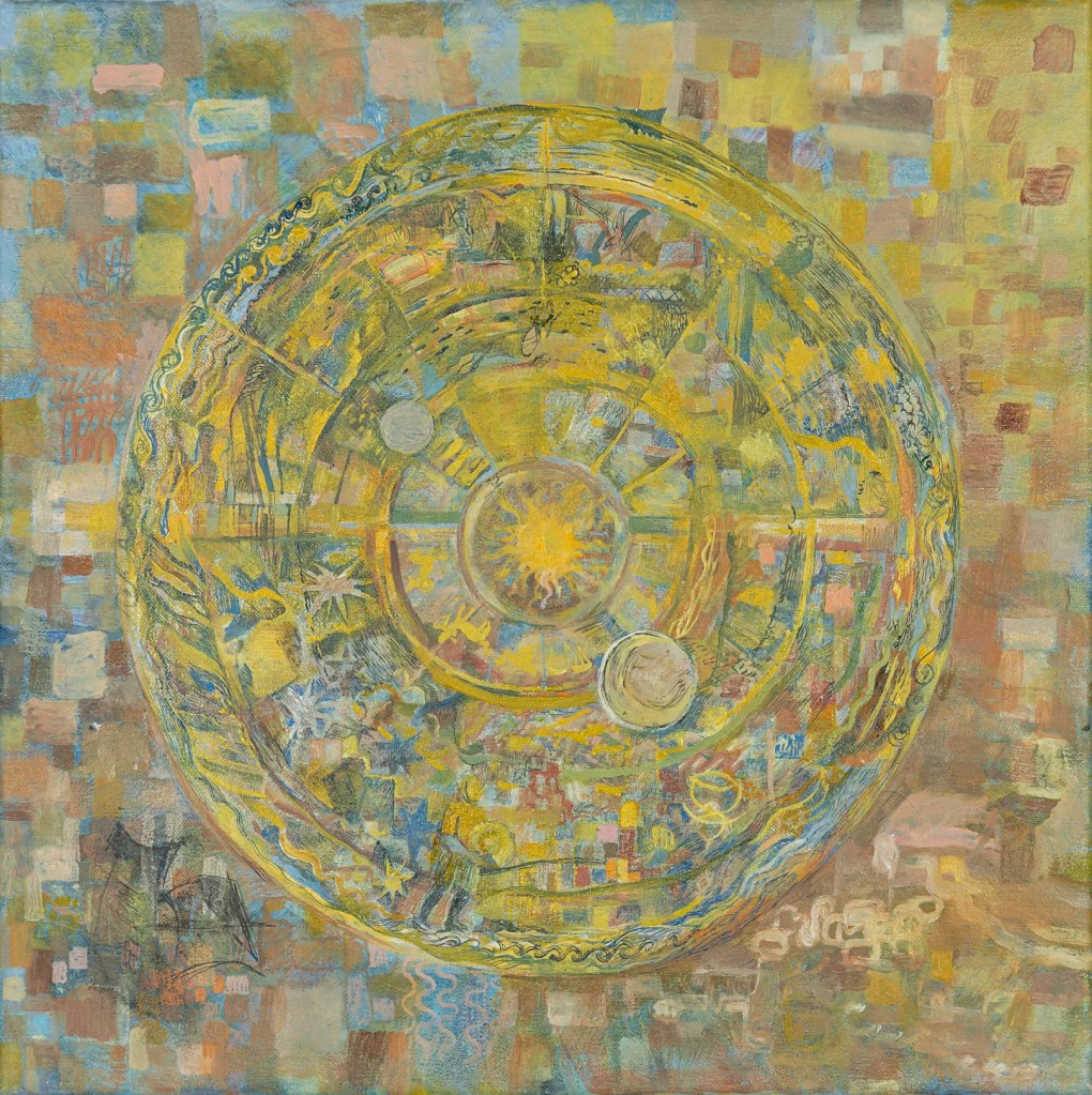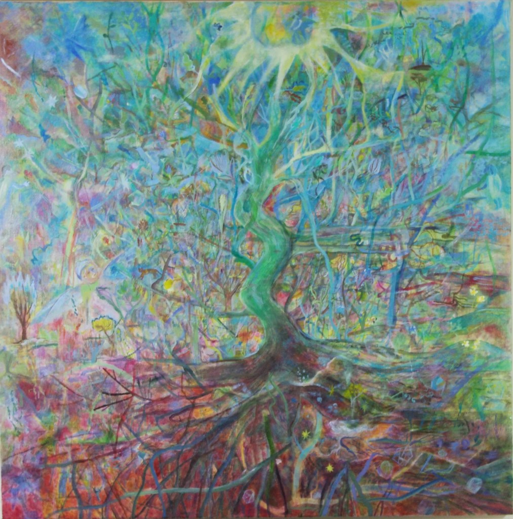 “This was a painting I wanted to get into, a world that I wanted to enter. The surface is teeming with all the shapes and forms and suggestions of things that suggest another world. It takes a little time to enter it – looking can sometimes be quite hard work. It makes me ask the question, how close is it possible to get into any painting? And reminds me also of that rather charming proposition by Wittgenstein that ‘…the world is everything that is the case’. In Andrea’s work this is explained. Everything here is the case. Because the way it’s painted and drawn and scratched, lightly, delicately, convinces you, yes, this is the case. Every one of these myriad marks has emerged, grown, from somewhere elemental in this artist. I don’t know if these events – birds and beasts, trees, flowers, suns, things within things, were a struggle for her to reach, or if they came teeming from her brush with little effort.”