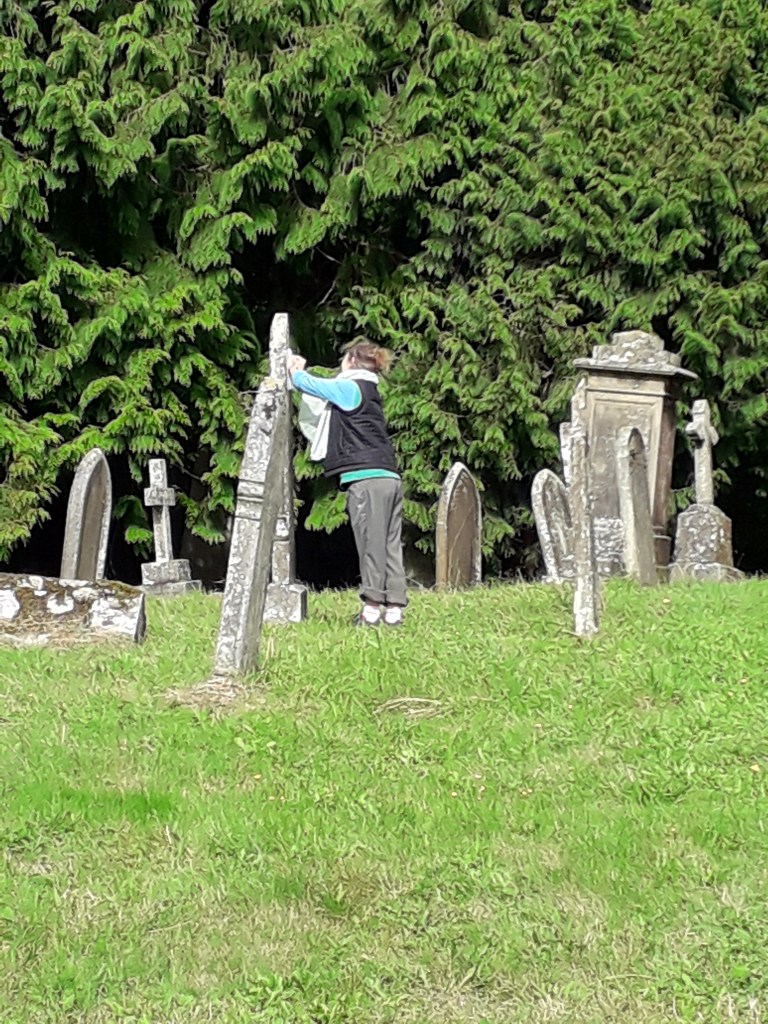 The churchyard provided a wealth of starting points – the first line of a poem, the shapes of stone carved letters and numbers and flowers that provided colour when squashed. As we rambled along the road we used viewfinders to notice the cracks on the tarmac where weeds burst through. These cracks like a city for ants. Suddenly a dragonfly, iridescent blue flew past us. Recording with photographs of surfaces, viewpoints and textures both close up and looking up. Being outside with huge beech and oak trees either side the air felt fresh after the shower and the sounds both natural and choreographed were a delight.