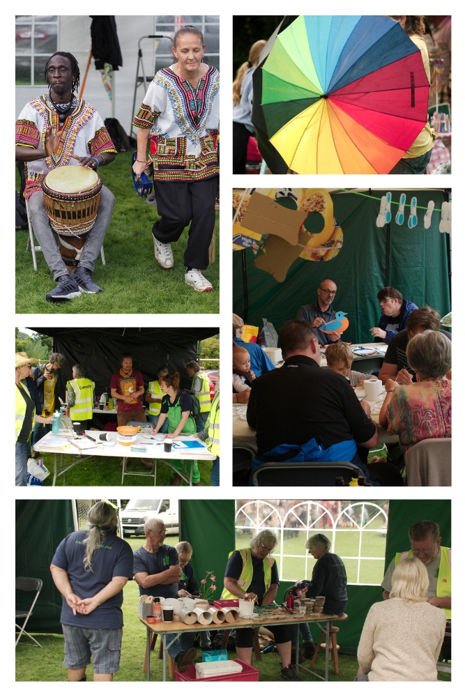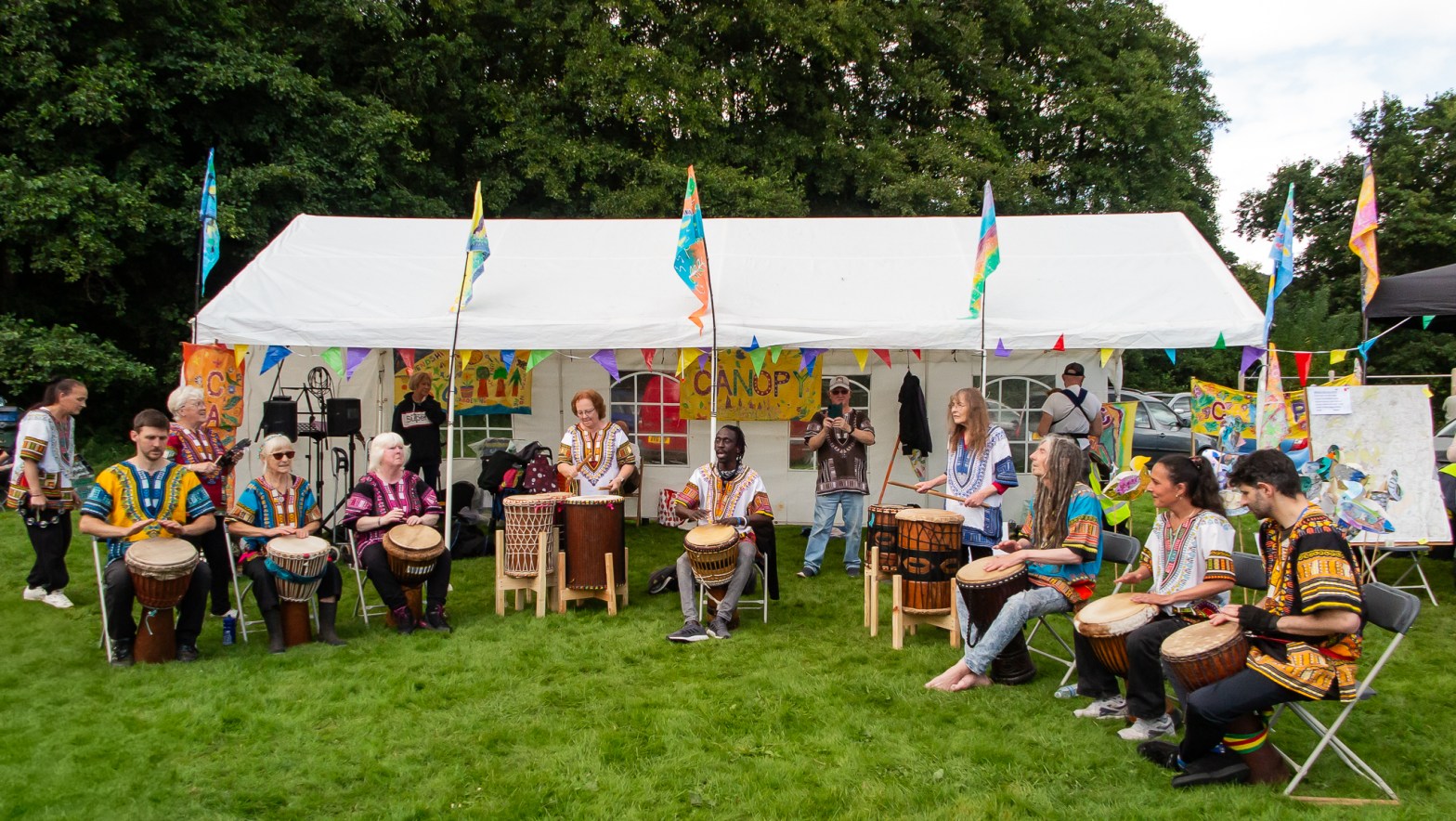 Canopy pitched 8 Arts stalls in the top corner of the Rec creating a real festival atmosphere. Wild Oats Morris danced to their musicians in their colourful dress with bells and sticks adding a traditional English element. Darren Hoskins drew a large audience with his hilarious story telling using a ‘Cranky’. Drybrook Male Voice Choir sang in emotionallymoving harmonies despite the heavy rain shower. Djabot, in their brightly patterned African attire, played rhythmically and loudly with their wide range of drums and instruments.