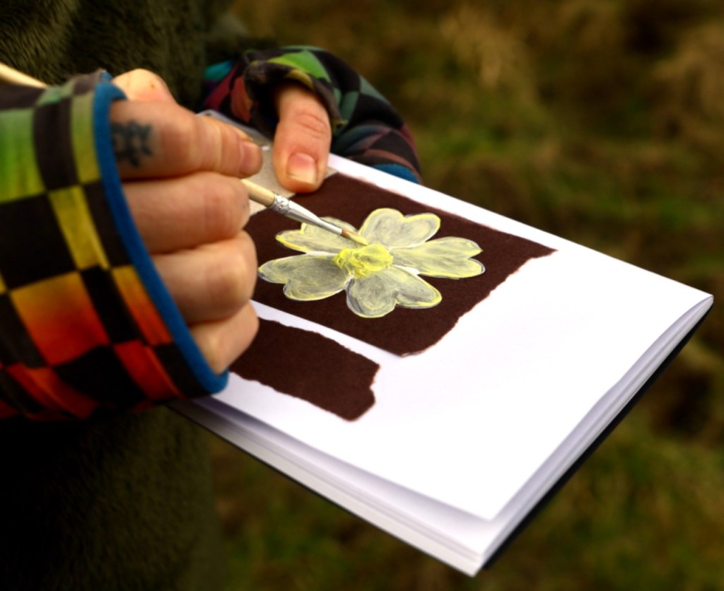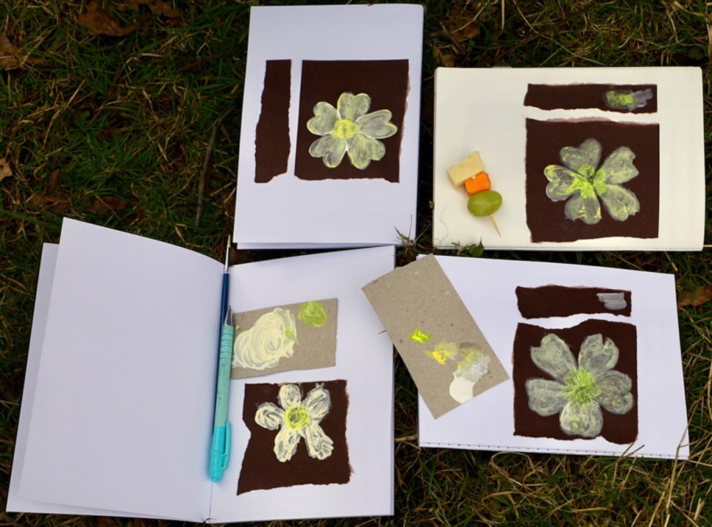 I showed the participants how each petal was the shape of a heart disappearing into the centre of the flower. We counted the number of petals – 5 – and sketched out the shapes on the dark brown paper provided in the sketchbooks. Providing poster paint, brushes and water, I demonstrated how to use white paint first to provide a base onto which to add the pale yellows. Standing up and painting outside whilst carefully examining a flower is an art in itself! The contrast of the pale yellows and green against the dark paper helped provide contrast to the study.