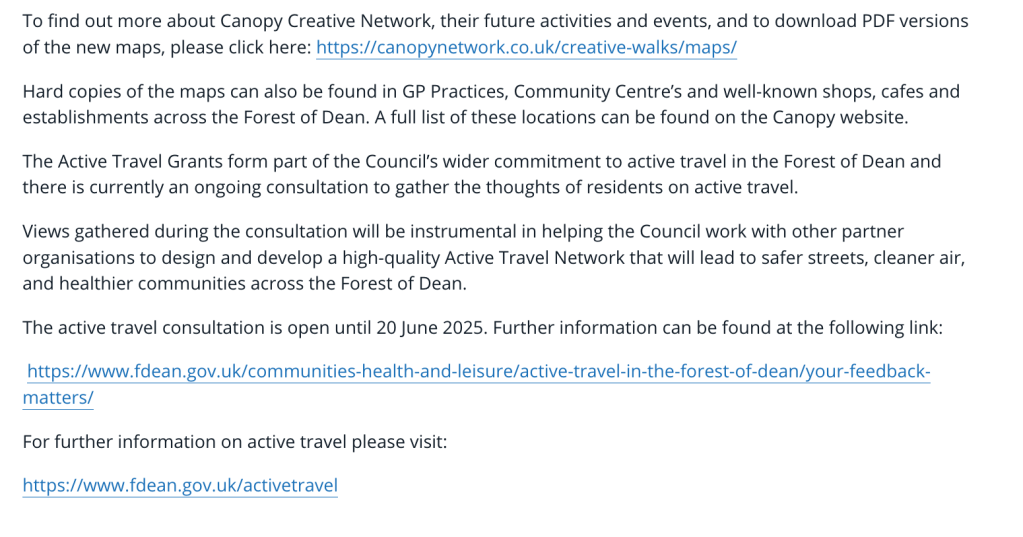 “Active travel promotes walking, cycling and wheeling in the Forest of Dean. We believe that active travel should be accessible and inclusive for all and these new maps and the improvements to routes at Cyril Hart Arboretum, Linear Park and Soudley Ponds will be of huge benefit with this.”