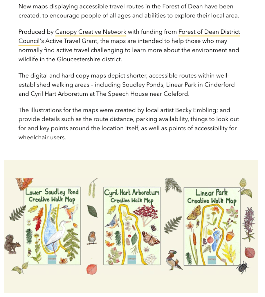 Produced by Canopy Creative Network with funding from Forest of Dean District Council‘s Active Travel Grant, the maps are intended to help those who may normally find active travel challenging to learn more about the environment and wildlife in the Gloucestershire district.