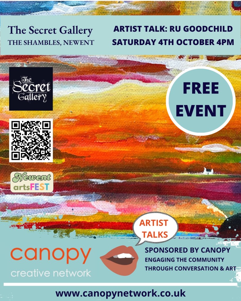 Join us for a Canopy sponsored Artist Talk at The Secret Gallery at The Shambles in Newent in conjunction with Newent artsFEST programme. Exhibiting Artist Ru Goodchild will be talking about her Inspiration and techniques for her stunning exhibition ‘Colours of the Wild’. Ru experiments with acrylic and acrylic ink, laying colours to create depth and texture. Through her work Ru communicates the emotion, wildness and dynamism of beautiful landscapes that she finds so captivating and inspiring. View her work here www.rugoodchild.co.uk