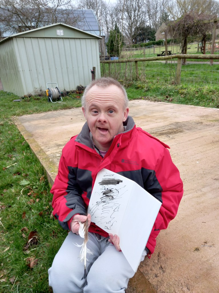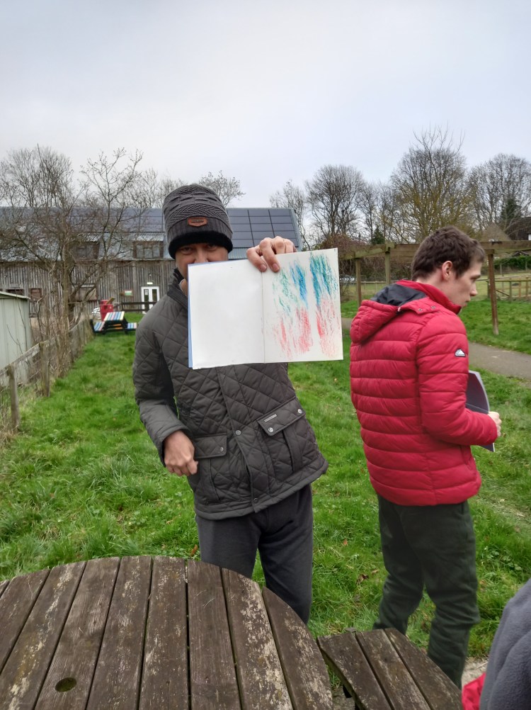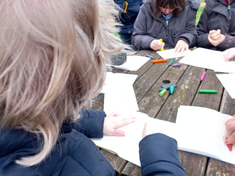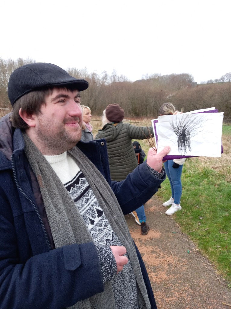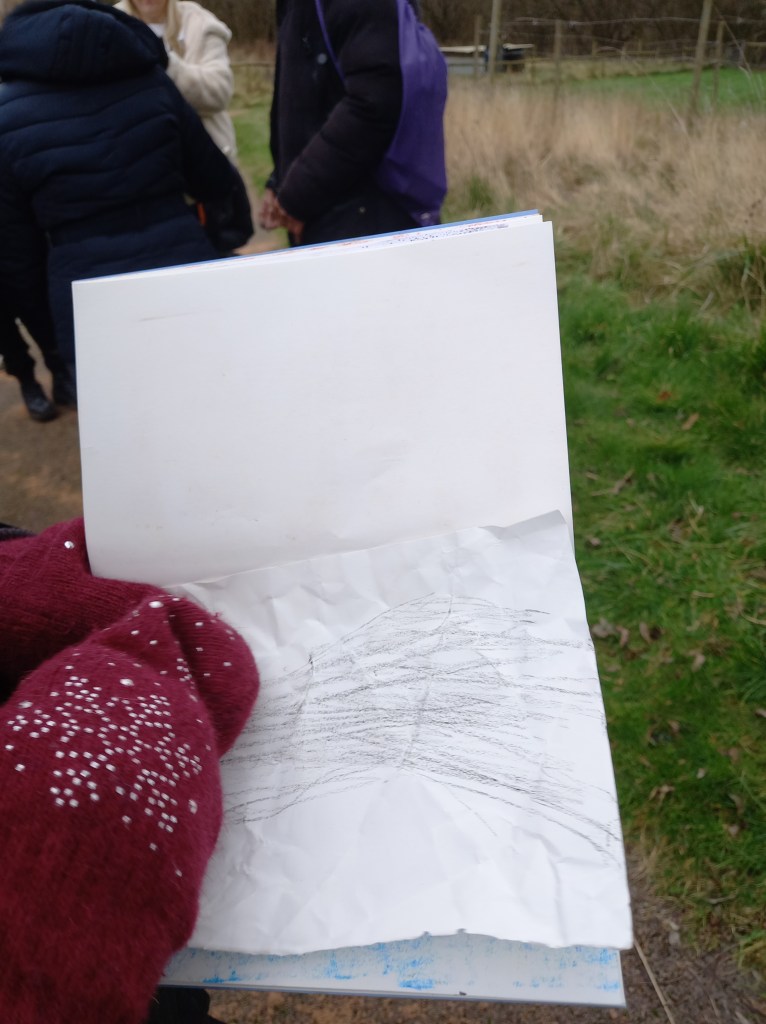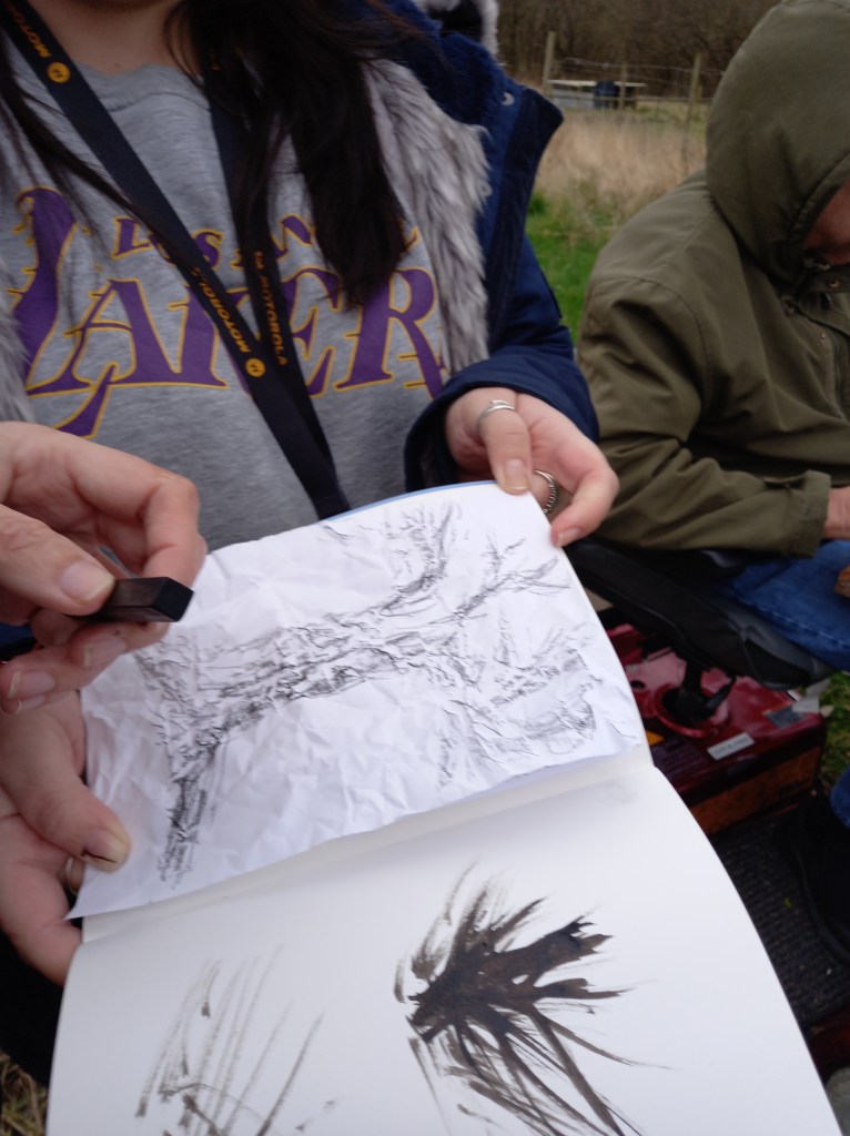 A huge Ash tree towards the end of the circular walk was an impressive stimulus. The group made shapes with their arms and legs to look like the very old tree. Sara demonstrated how to screw up a piece of paper, unfold it carefully and use charcoal to rub the creases to look like bark. Some people gave the tree a hug!