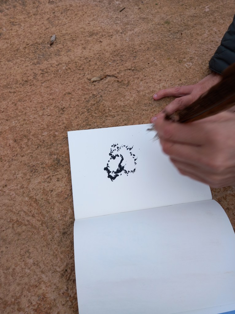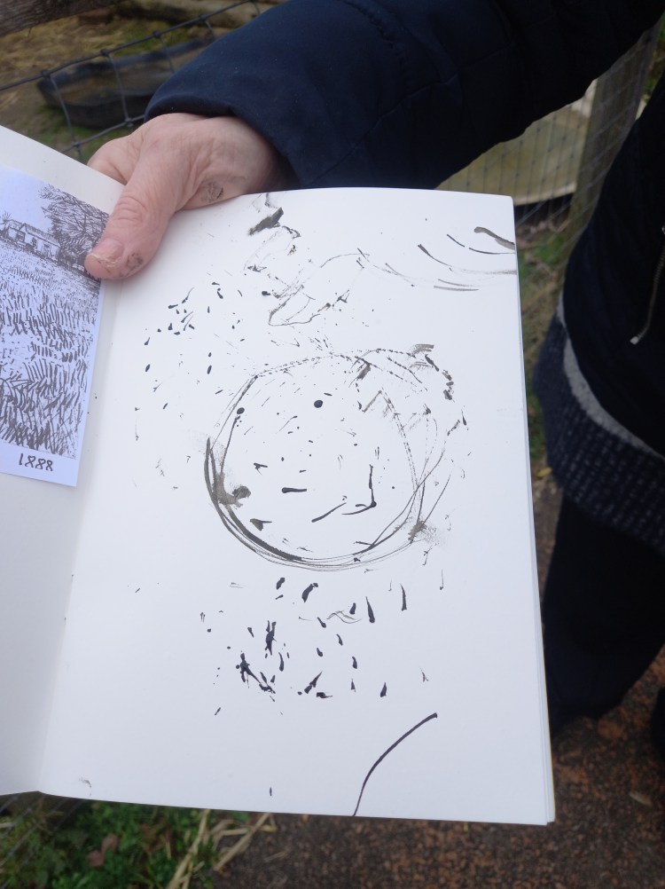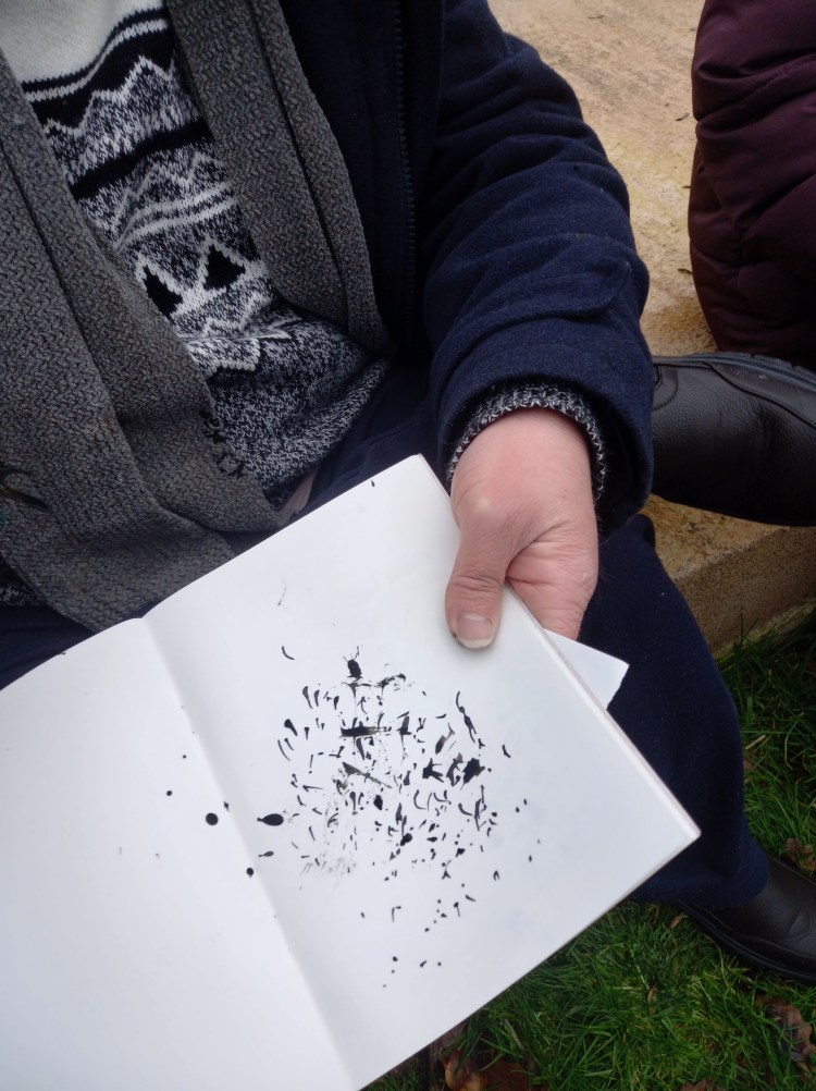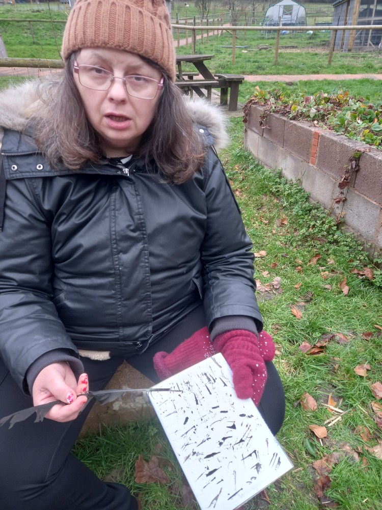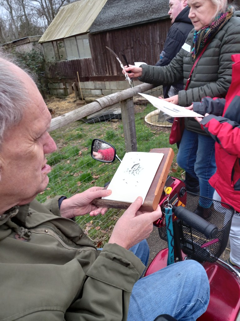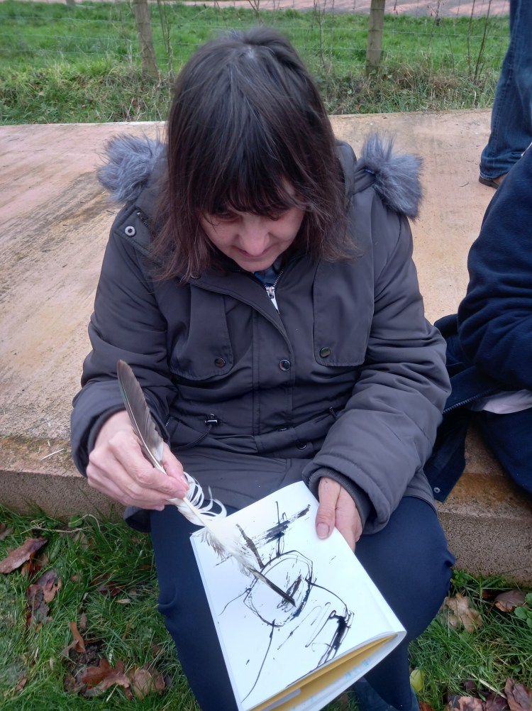 Starting at a picnic table participants made rubbings of the wood grain. Nearby, were dotty, flecked bantams peaking in their run. A photocopy of a Van Gogh pen and ink drawing showing mark making with dots and lines was discussed. Sara showed how feathers cut as quills dipped into ink can be used to draw with, to create dots and marks.
