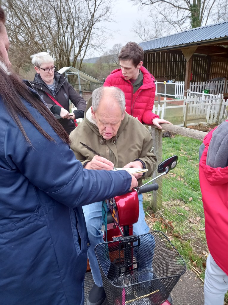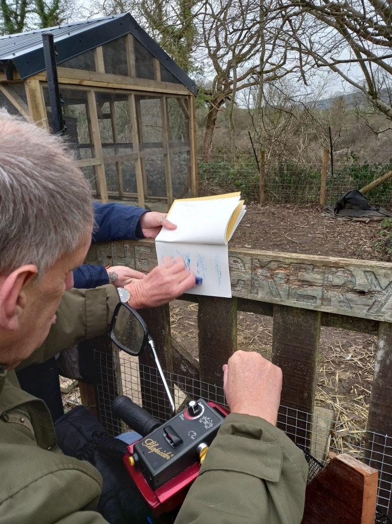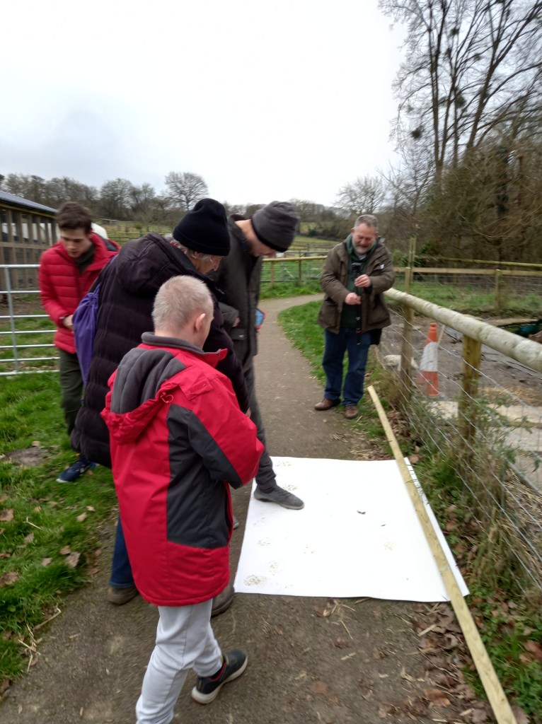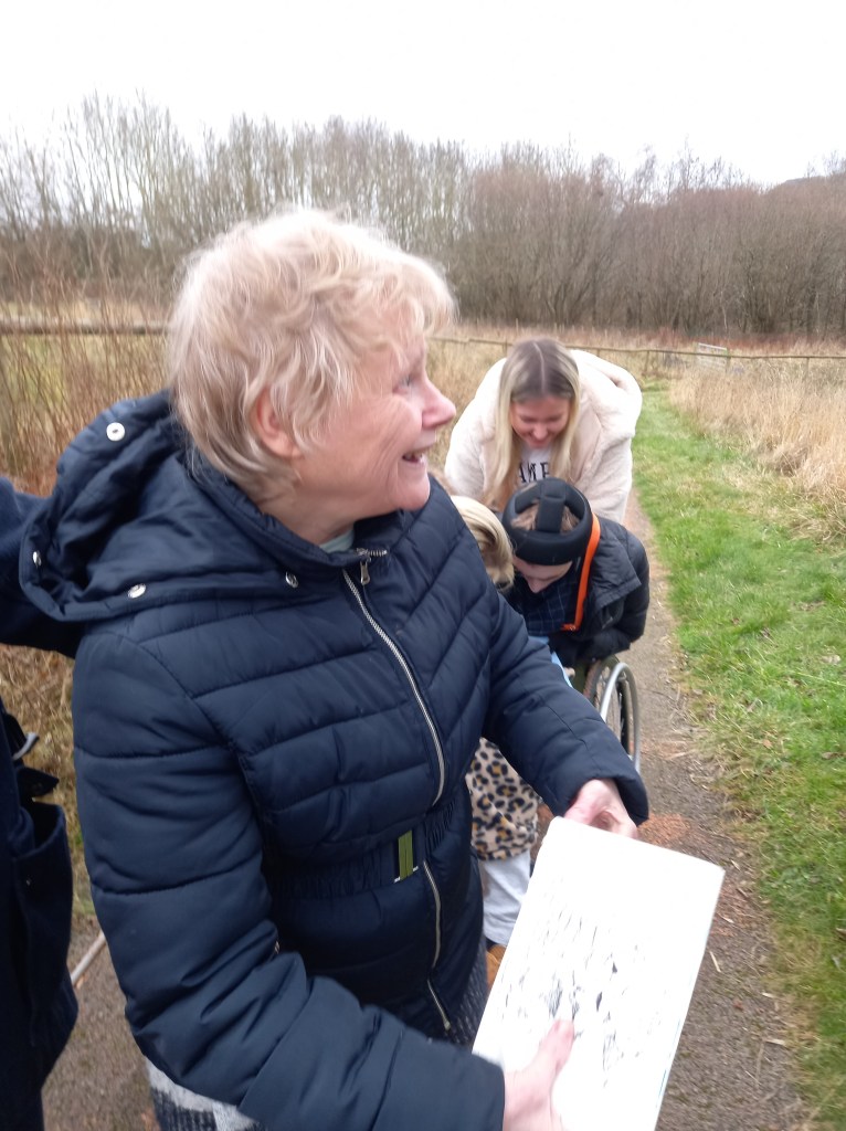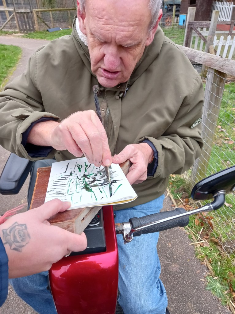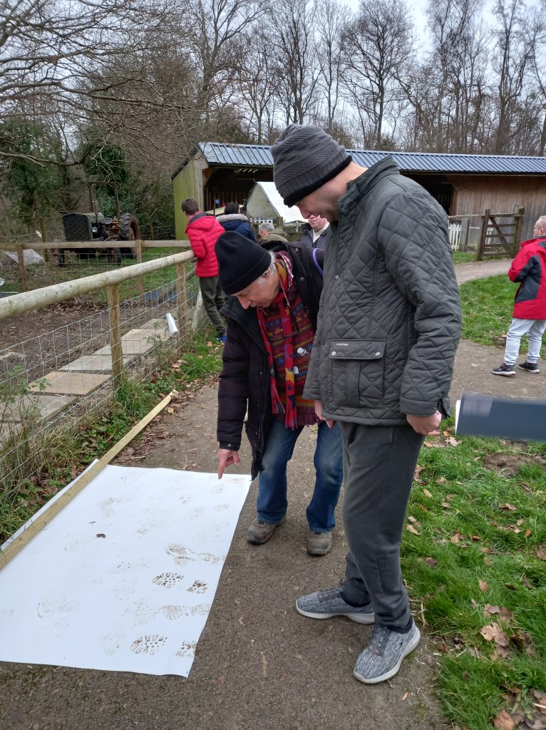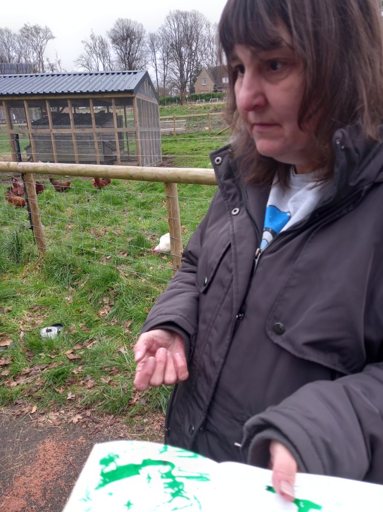 Further along the path, some people made rubbings of letters from a carved wooden sign for ‘The Duckery’, whilst other made mud with water on soil to get the soles of their shoes dirty. Walking across a huge 4’x 6’ piece of paper different footprints were revealed. Alex and Chris in wheelchairs steered their way through the mud creating trye prints.
