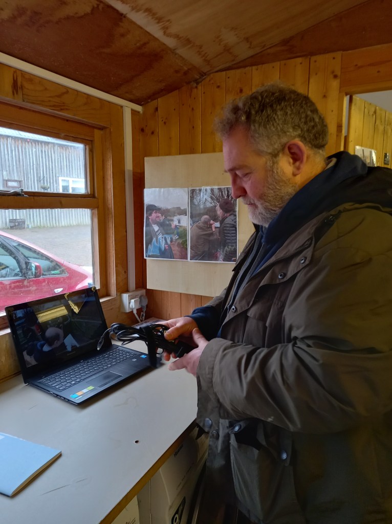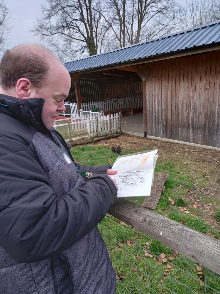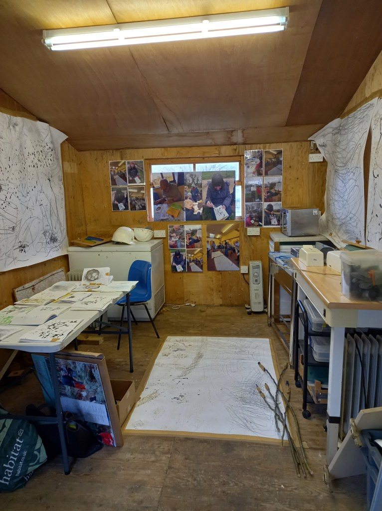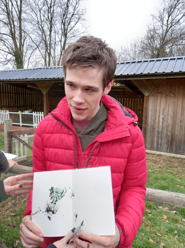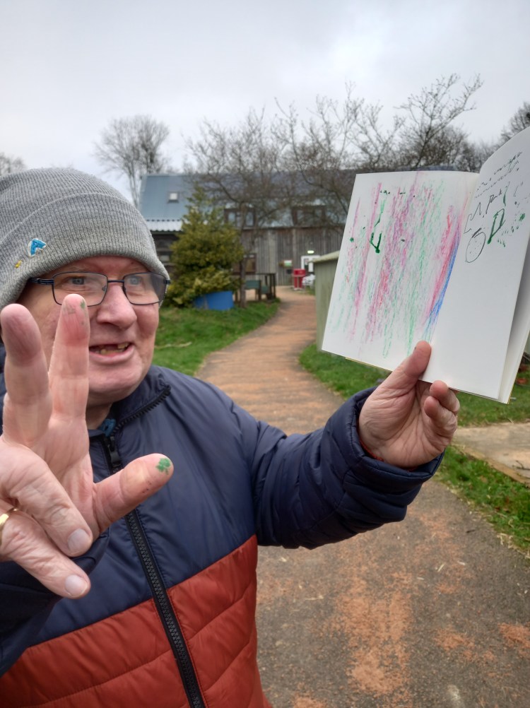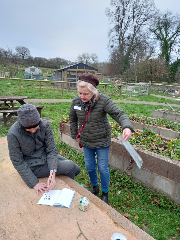 This work was celebrated on 14th February for Valentine’s Day, and the 35th Anniversary of the Orchards Trust. Families, friends, trustees and invited guests were able to browse through the sketchbooks and have a go at using long sticks to draw with.