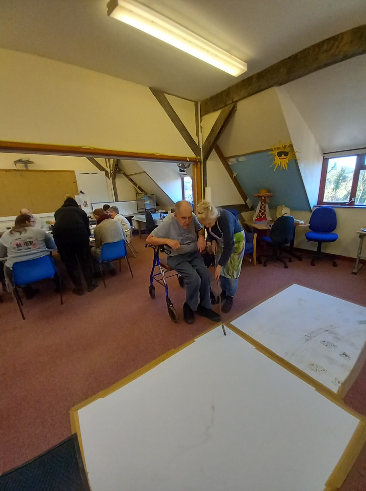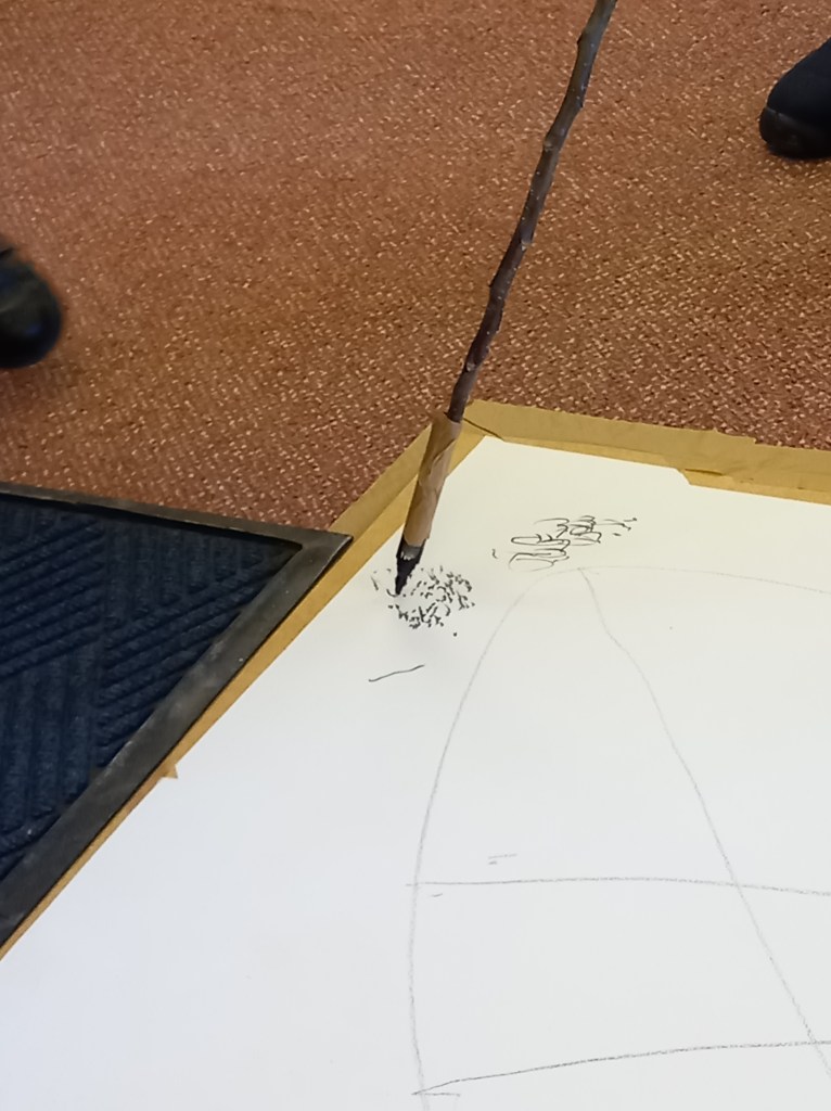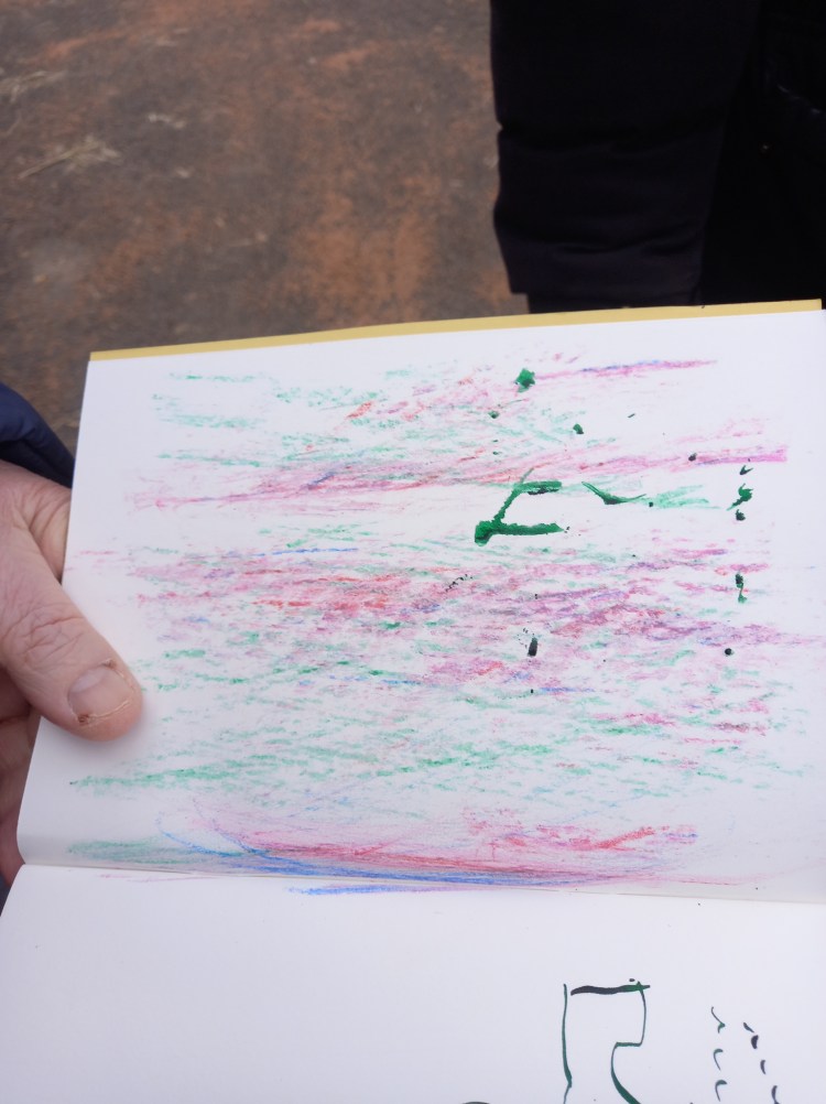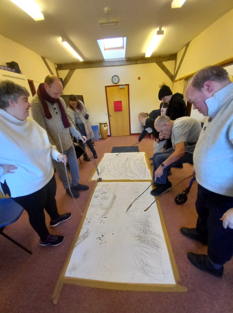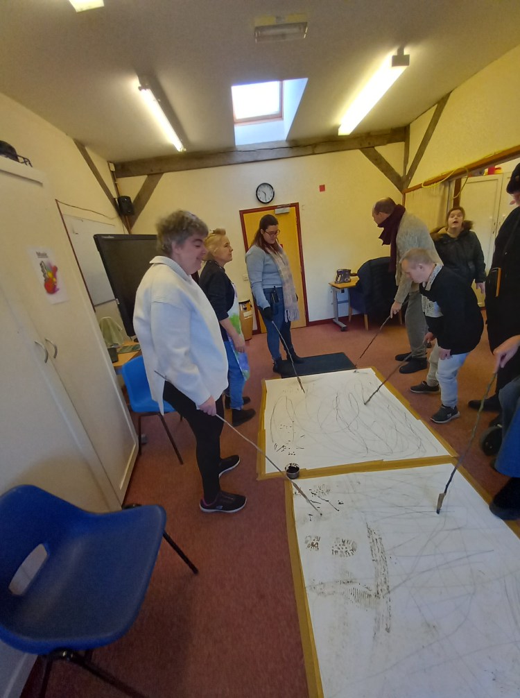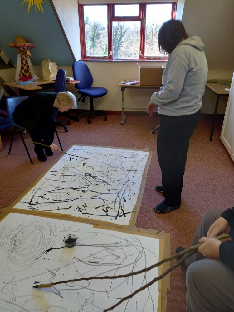 For the final activity everyone was given a very long stick, cut from a tree, which had either a paint brush, a felt tip pen, charcoal or oil pastel tied to the end. Standing or sitting above the large pieces of white paper started on the walk with foot and tyre prints, the group enjoyed making marks, lines and exciting scribble to express themselves!