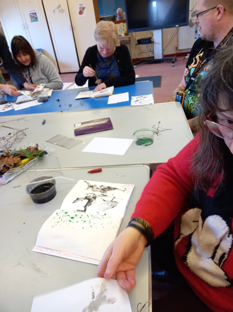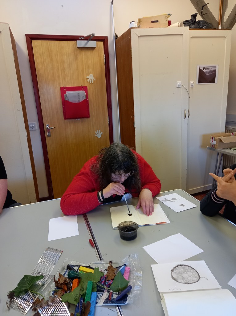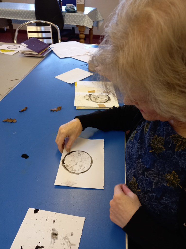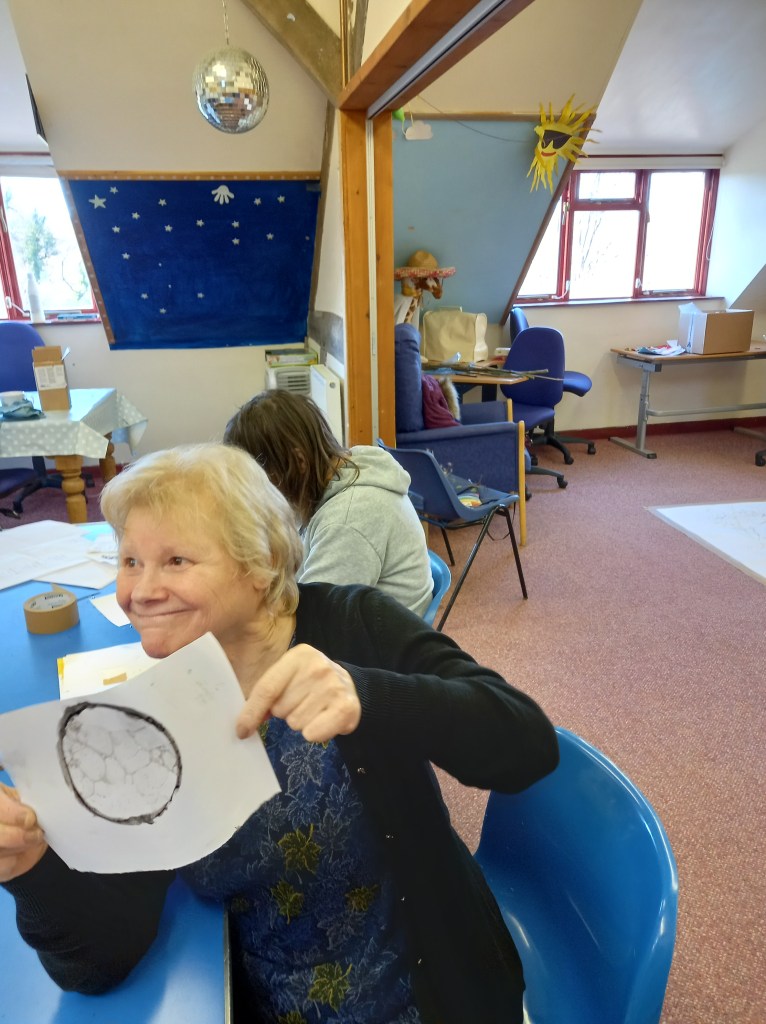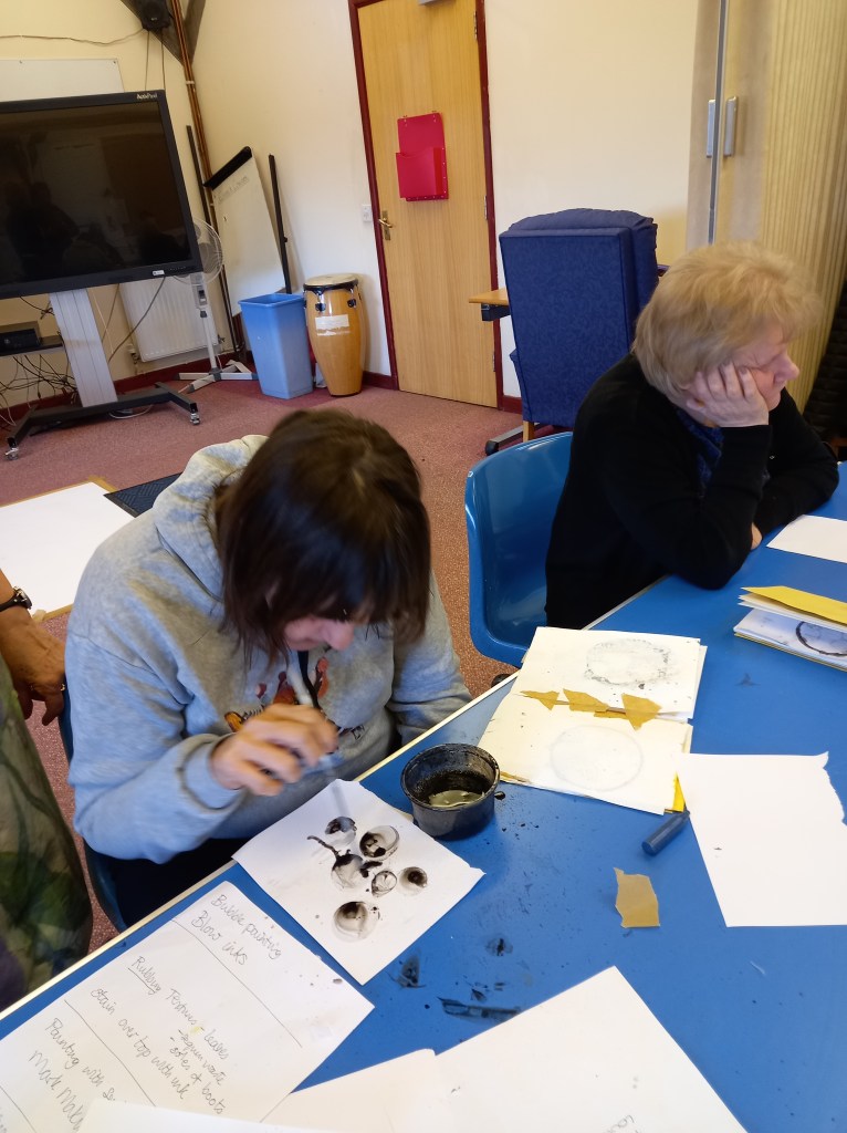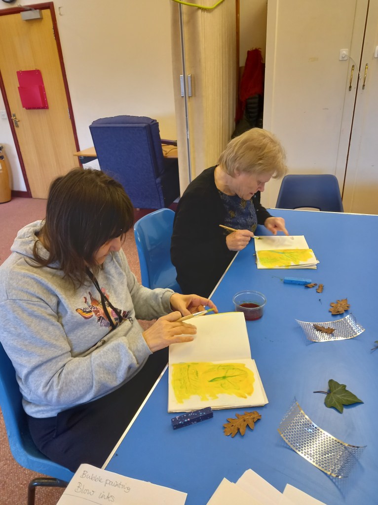 The second visit was a workshop in The Orchard Trust Art/Craft room. Re-visiting the task of rubbing, oak and ivy leaves were rubbed with wax crayons to show their veins. These were then painted with coloured inks showing how the wax resists the watery inks. Next with tubs of paint, washing up liquid and water we made bubbles by blowing through a straw. With a piece of paper ready, this was placed on the tub lid and a bubble print was made! Very exciting to see the range of lines and patterns created by the bubbles. Some people also had a go at blowing ink around a piece of paper to see the random lines it would make.