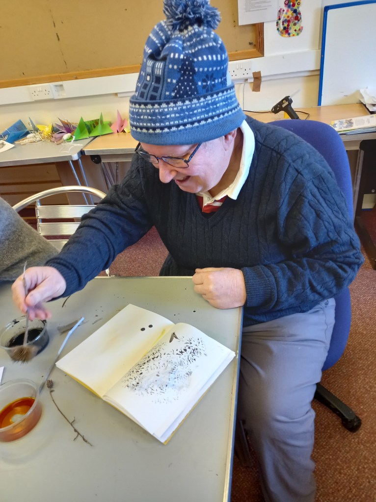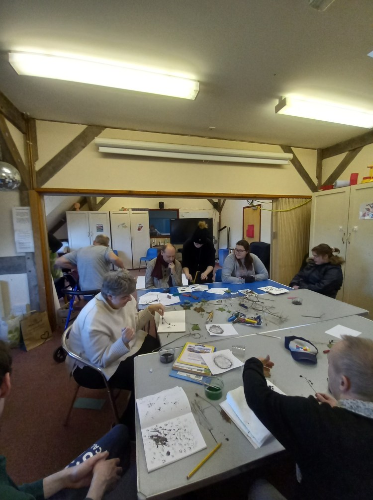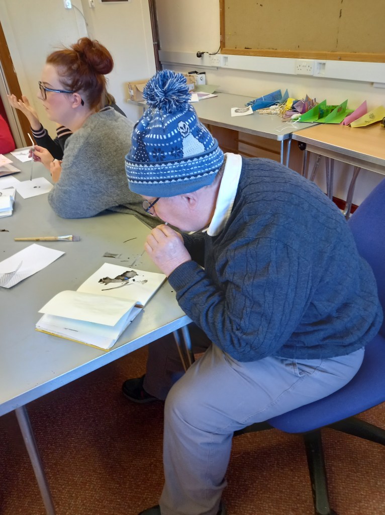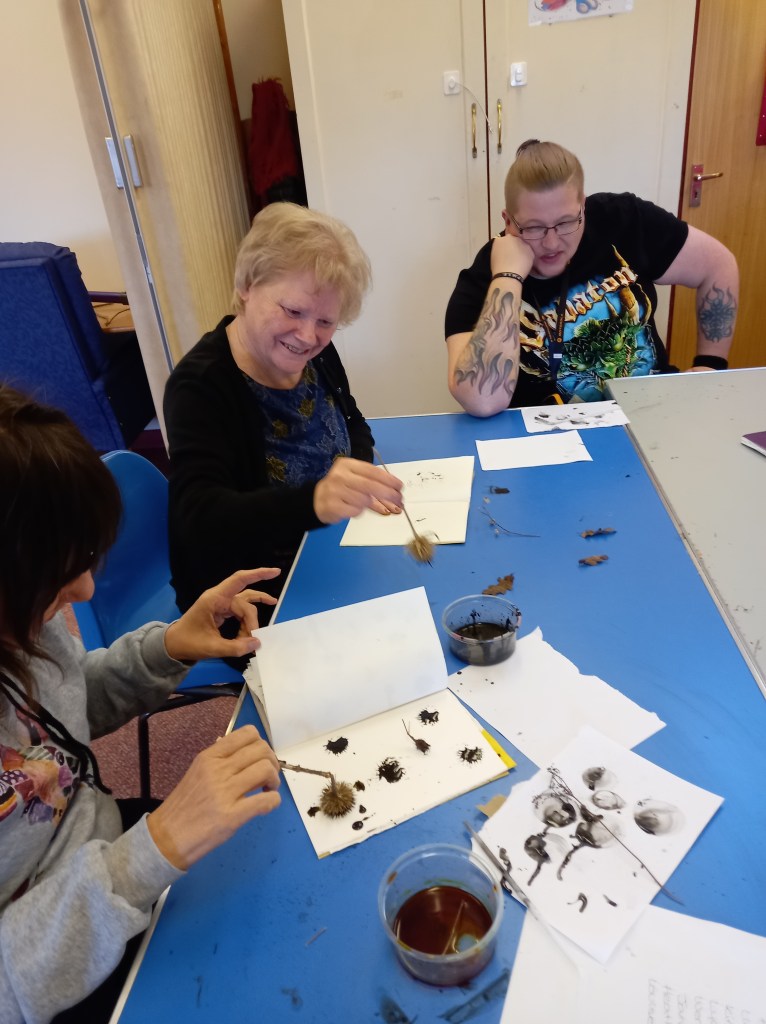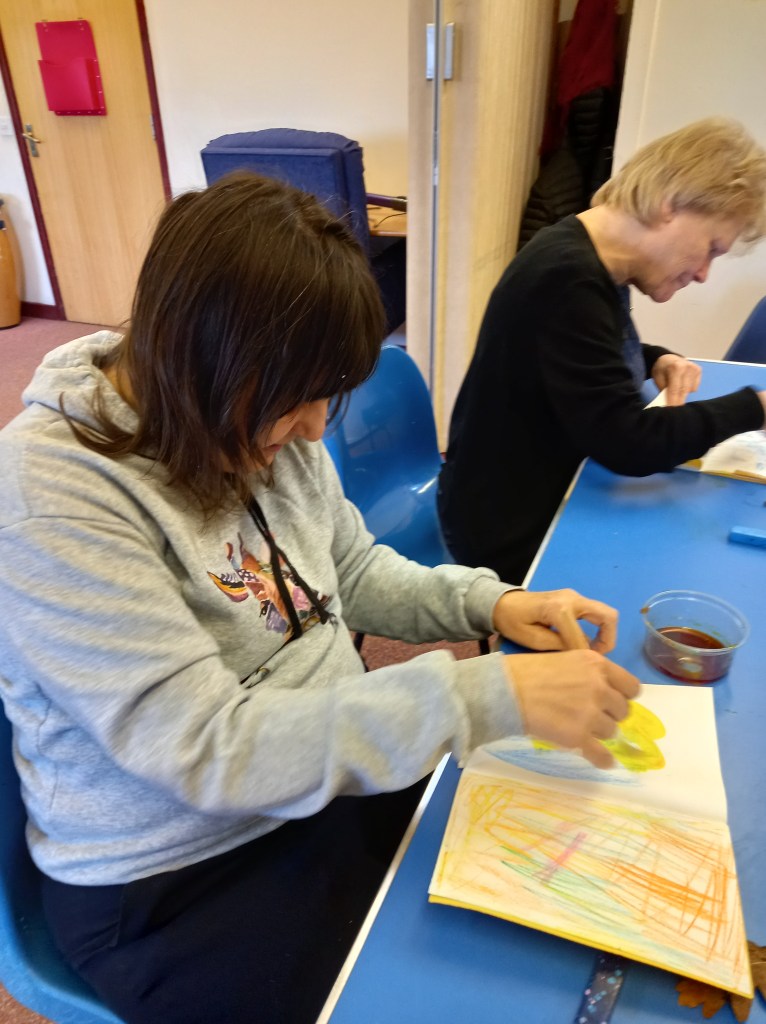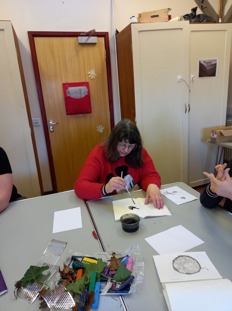 The second visit was a workshop in The Orchard Trust Art/Craft room. Re-visiting the task of rubbing, oak and ivy leaves were rubbed with wax crayons to show their veins. These were then painted with coloured inks showing how the wax resists the watery inks. Next with tubs of paint, washing up liquid and water we made bubbles by blowing through a straw. With a piece of paper ready, this was placed on the tub lid and a bubble print was made! Very exciting to see the range of lines and patterns created by the bubbles. Some people also had a go at blowing ink around a piece of paper to see the random lines it would make.