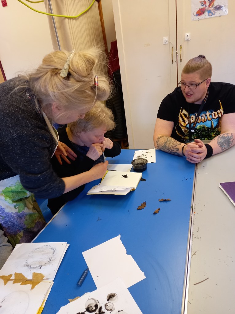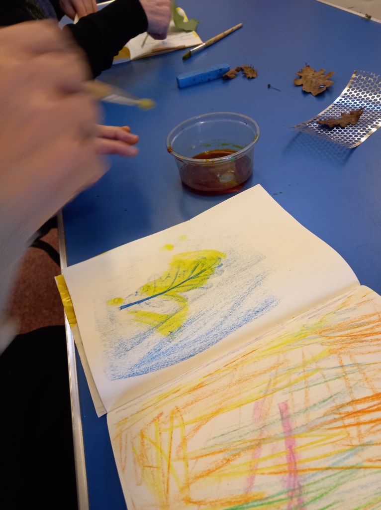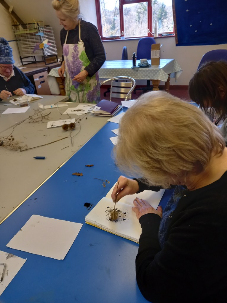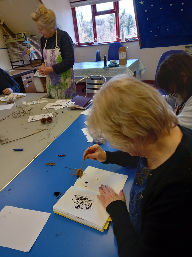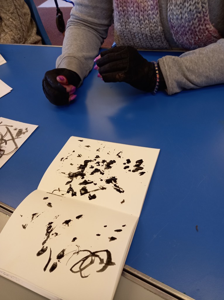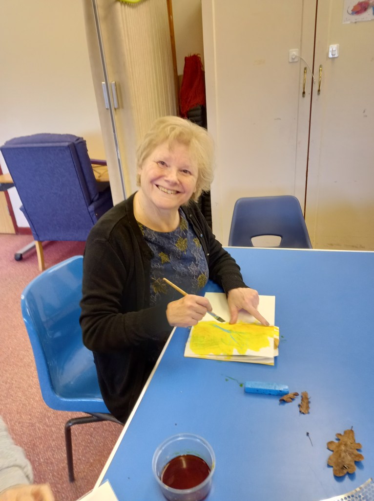 The second visit was a workshop in The Orchard Trust Art/Craft room. Re-visiting the task of rubbing, oak and ivy leaves were rubbed with wax crayons to show their veins. These were then painted with coloured inks showing how the wax resists the watery inks. Next with tubs of paint, washing up liquid and water we made bubbles by blowing through a straw. With a piece of paper ready, this was placed on the tub lid and a bubble print was made! Very exciting to see the range of lines and patterns created by the bubbles. Some people also had a go at blowing ink around a piece of paper to see the random lines it would make.