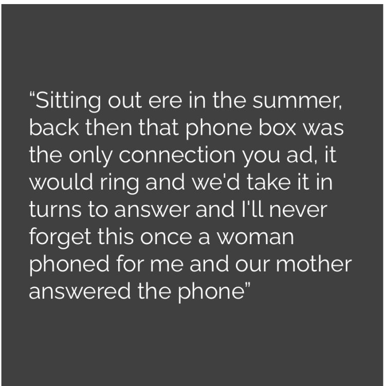 “Sitting out ere in the Summer, back then that phone box was the only connection you ad, it would ring and we’d take it in turns to answer and i’ll never forget this once a woman phoned for me and our mother answered the phone”