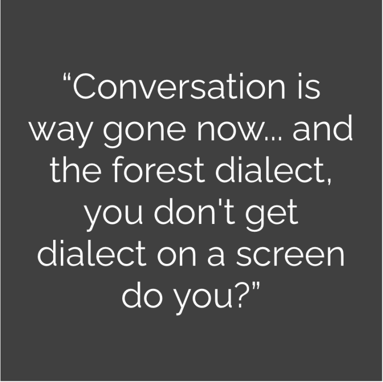 “Conversation is way gone now… and the forest dialect, you don’t get dialect on a screen do you?