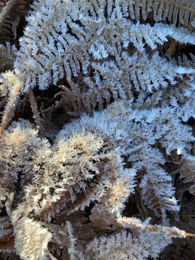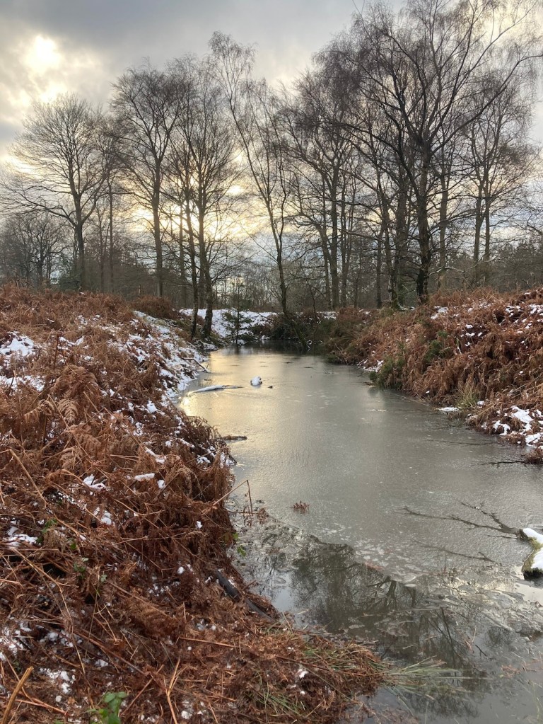 Now I’m on what one of the wider forest tracks. It’s got that lovely sound that snow has under your feet. You know that sort of warm crunchy sound. You hear that crunch? It’s melted a bit here, blue sky above, lots of lovely trees. A range between the conifers, and the old woodland, deciduous trees: the beech and chestnuts. There’s a little brook running to the side of me and a fern that is actually still green. It’s the bracken that’s died back. The boar hide underneath the bracket this time of year, so if you go through the bracken and you hear a rumble or some noises, it means you’ve probably disturbed a boar.