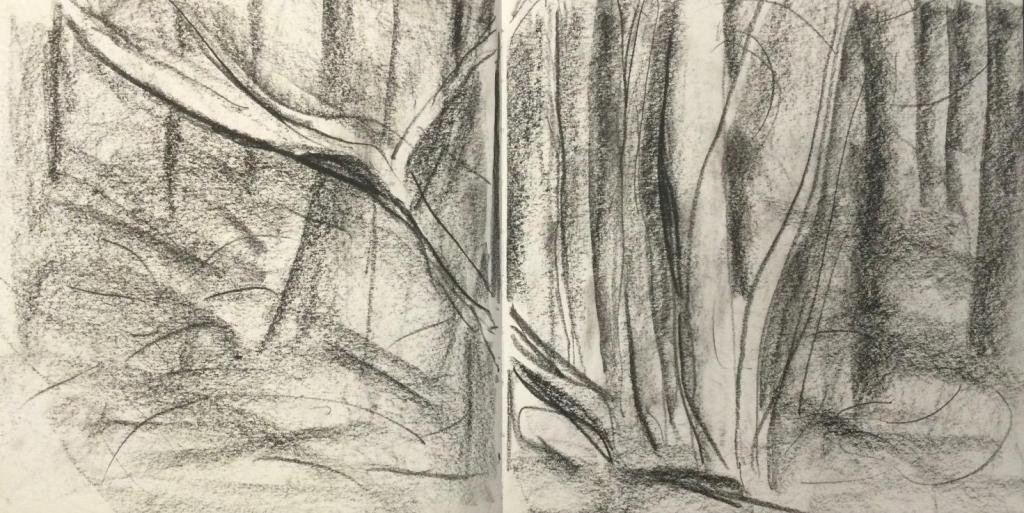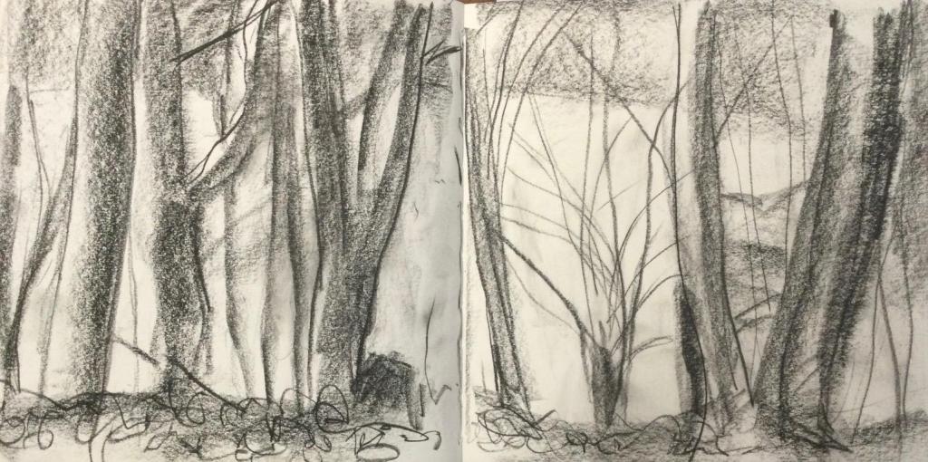 “There are a Couple of beech trees in front of me, parallel to each other into the sky. It’s only a small plantation of conifers, actually, but there are some larch trees behind, which will probably have to come down because there’s a disease and they’re going to fell most of the large ones to stop it spreading in the Forest. It’s very poignant, isn’t it? Given the situation we’re in.”